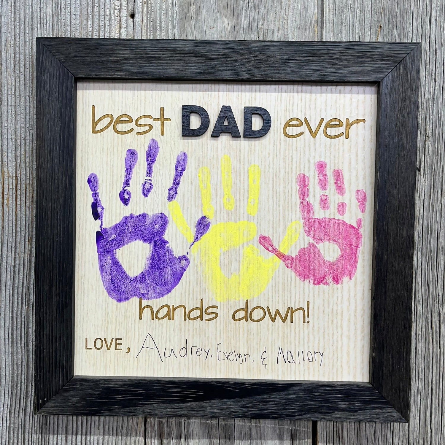 This Best Dad Ever Hands Down Sign is perfect for Father's Day. Each one is made with plenty of room to add your child's handprints and to write their names for a unique gift that he's sure to cherish. Show Dad he's the best with this special sign.