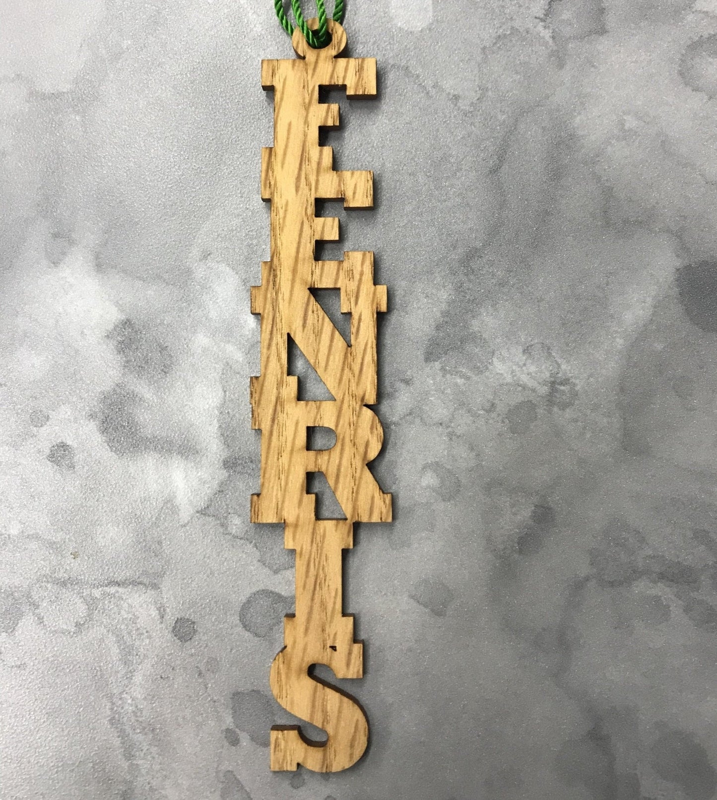 Personalize this name ornament with the name of your choosing. Up to 8" in length. Size of ornament and letters will vary depending on the length of the name. One name per ornament.